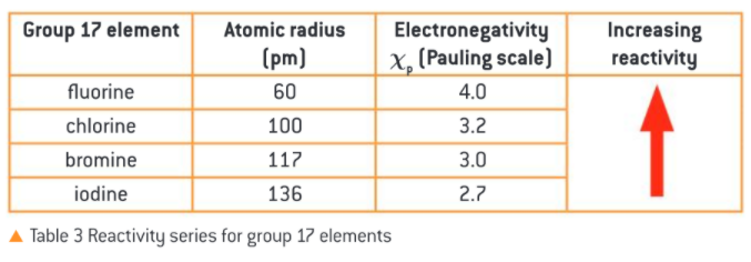 Opposite of the activity series, the reactivity series deals with reactions regarding the group 17 elements. In their case, smaller atomic radius and higher electronegativity means an increase in reactivity as evident from the graph.