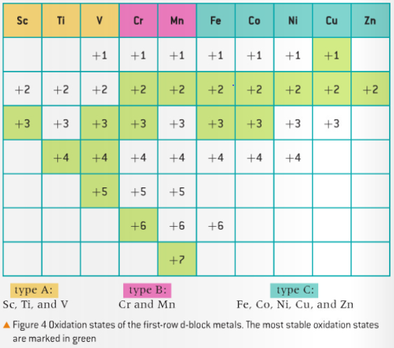-As mentioned in the rules assigning oxidation states above, although many elements have fixed oxidation states, in their ions and compounds, such as the group 1 alkali metals and the group 2 alkaline earth metals, variable oxidation states exist for many main-group non-metals and in particular for most of the transition elements. What is special is that variable oxidation states are a characteristic property of the transition metals. The range of oxidation states for the figure below is demonstrated in the d-block elements below, which is in section 14 of your IB data booklet! Make sure you remember this for your exam. Not to mention, IUPAC describes transition elements whose atoms have an incomplete d-subshell. As you can see in the first row, d-block elements, the transition elements are Sc to Cu inclusive.