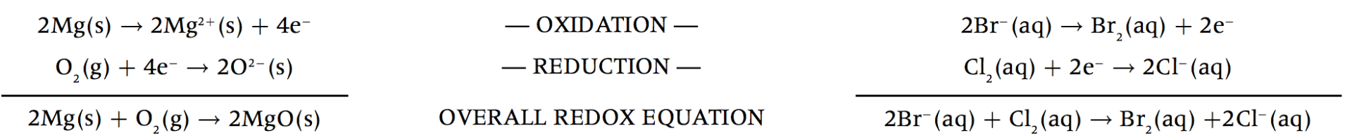 If a substance loses electrons then something else must be gaining electrons. The gain of one or more electrons is called reduction. In the first example oxygen is reduced as it is gaining two electrons from magnesium to form the oxide ion O2- . Similarly, in the second example chlorine is reduced as each chlorine atom gains one electron from a bromide ion to form a chloride ion. Since the processes involve the transfer of electrons oxidation and reduction must occur simultaneously. Such reactions are known as redox reactions. In order to distinguish between the two processes half-equations are often used: